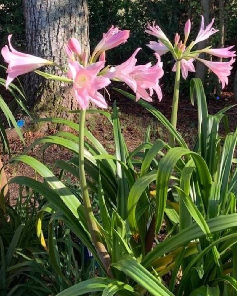 Les hampes florales du crinum émergent des touffes de feuilles portant jusqu'à 15 fleurs rose ressemblant à l'amaryllis en été.